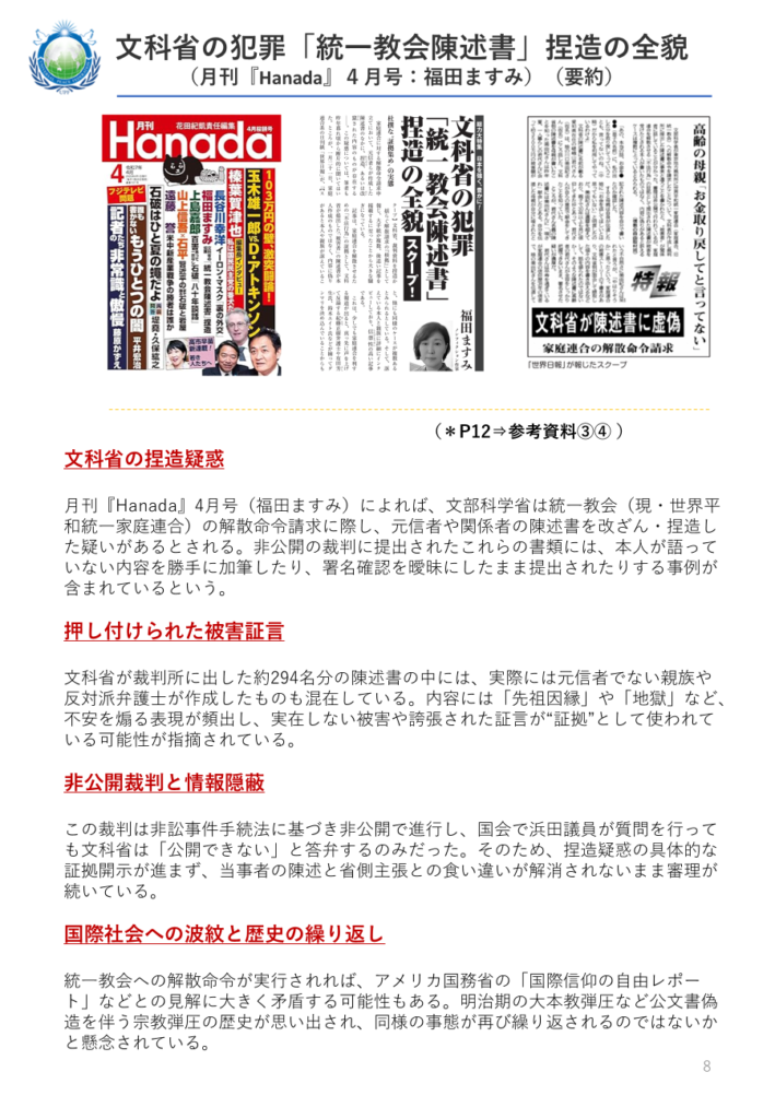 2025年4月号の月刊『Hanada』にて、福田ますみ氏が文部科学省の違法行為を指摘するスクープ記事を発表しました。記事によると、統一教会(世界平和統一家庭連合)に対する解散命令請求の際、文科省が捏造・改竄された陳述書を証拠として提出していた疑いがあるといいます。本記事では、その全貌をわかりやすく解説します。