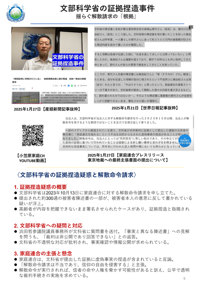 世界平和統一家庭連合(家庭連合、旧統一教会)は19日、文部科学省が東京地方裁判所に解散命令請求の証拠として提出した陳述書の中に、「意図的・組織的に虚偽事実を記載した捏造(ねつぞう)証拠が複数含まれている」ことを公式ホームページで明らかにした。