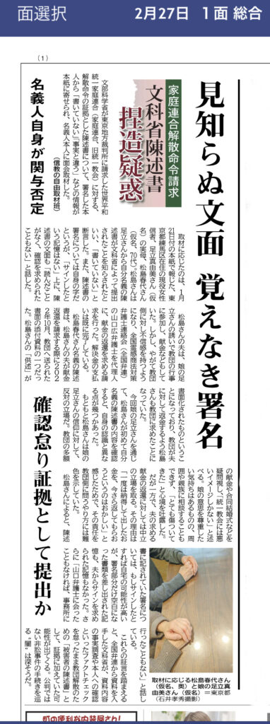 【スクープ第3弾】見知らぬ文面 覚えなき署名 確認怠り証拠として提出か 名義人自身が関与否定 家庭連合解散命令請求 文科省陳述書捏造疑惑
